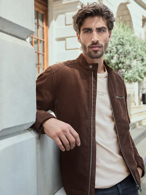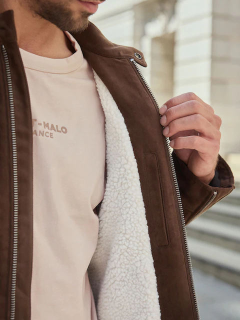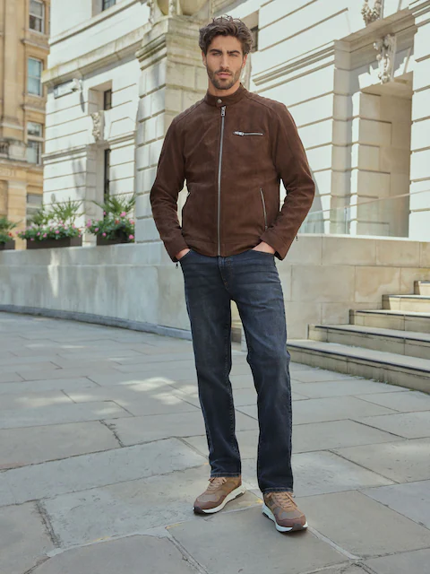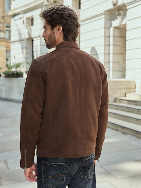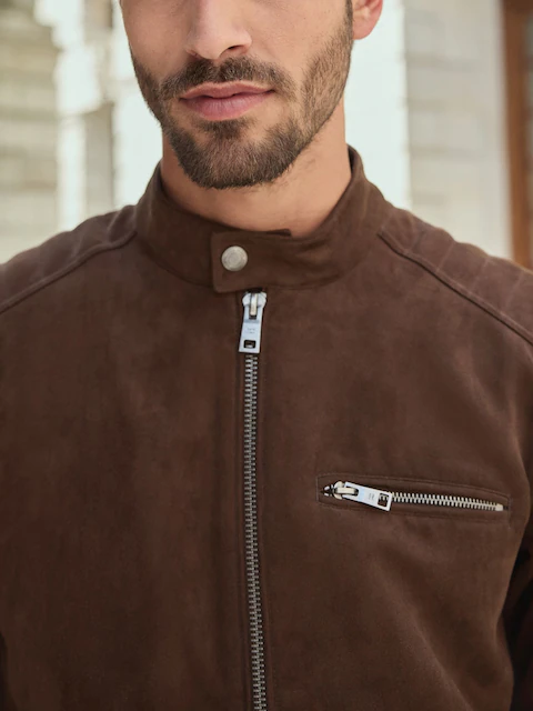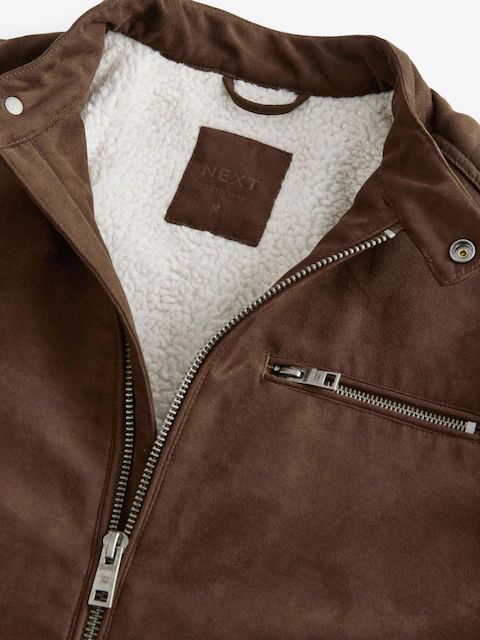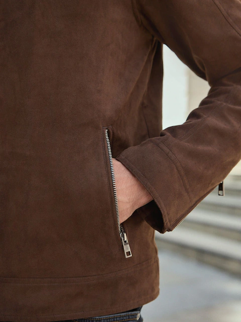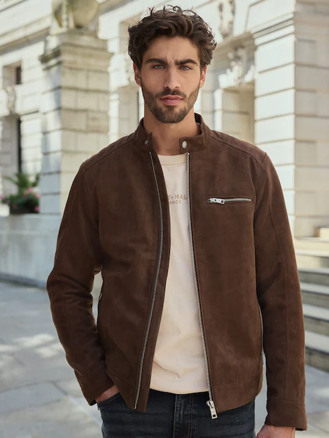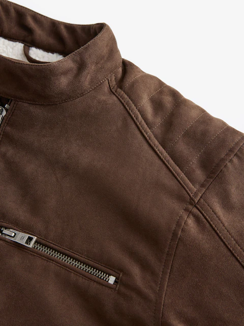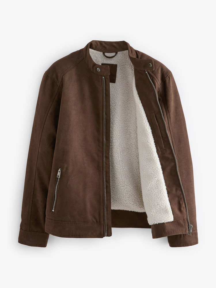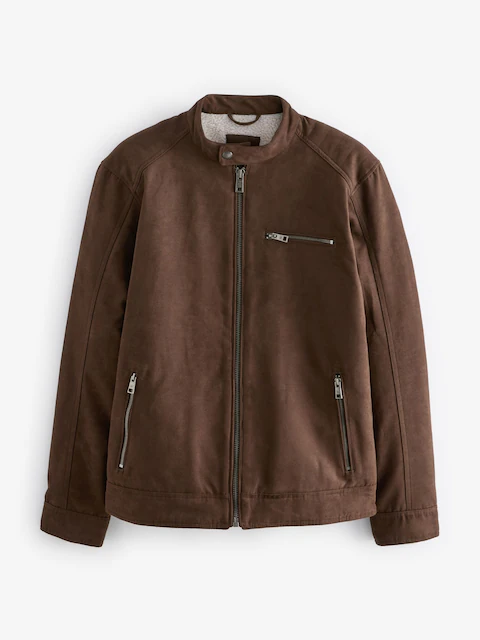 Channel the edgy trend with our men’s brown faux suede biker jacket. Made from a soft faux suede fabric, this rich brown jacket features borg lining for added warmth. Finely finished with zip fastening, pockets and a racer snap neck, this stylish jacket makes the perfect outerwear piece for the transitional season.